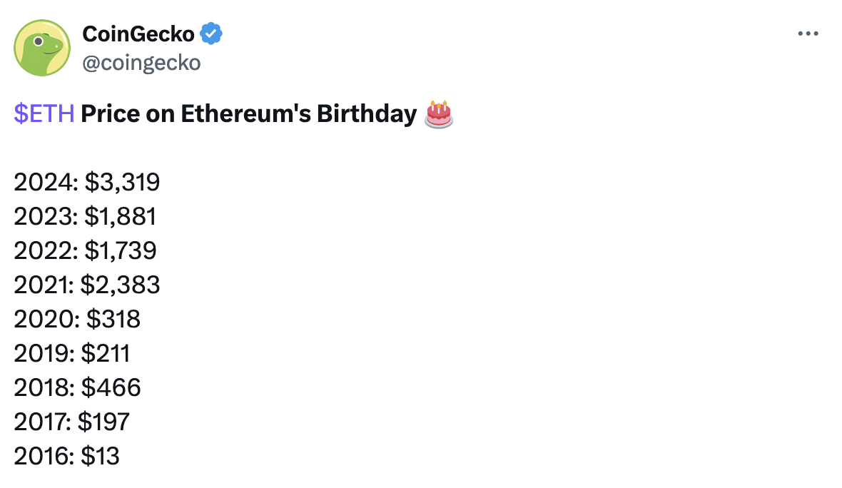 В день рождения Ethereum аналитики CoinGecko показали, сколько стоил ETH в свой день рождения в разные годы. Так, в период с 2020 по 2021 год стоимость криптовалюты подскочила на 649%, но следующие два года провела на уровне ниже $2 000.