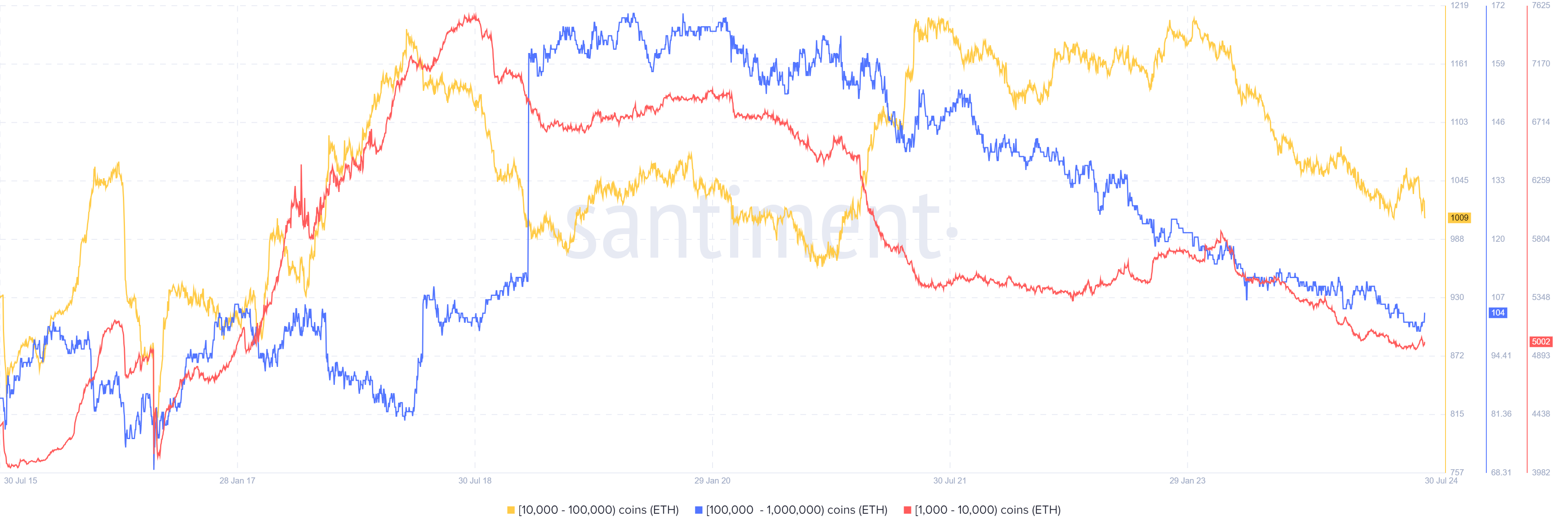 Ethereum-киты все чаще продают ETH. Как показано на графике ниже, количество адресов с более чем 100 монет на балансе в последние несколько лет устойчиво снижается. Сейчас показатель находится на многолетних минимумах. Это говорит о том, что ранние инвесторы, вложившие деньги в Ethereum на самой заре проекта, начинают получать прибыль от своих инвестиций и потому продают монеты.