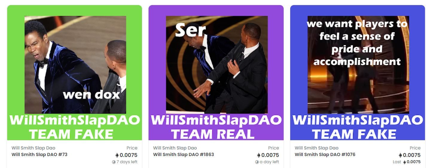 По состоянию на момент написания новости, средняя цена NFT Will Smith Slap DAO, по данным маркетплейса – 0,0074 ETH. Токены проекта успело купить свыше 500 человек. Всего создатели NFT по мотивам пощечины Уилла Смита успели заработать более чем 4 Ethereum (свыше $13 тыс., по текущему курсу).