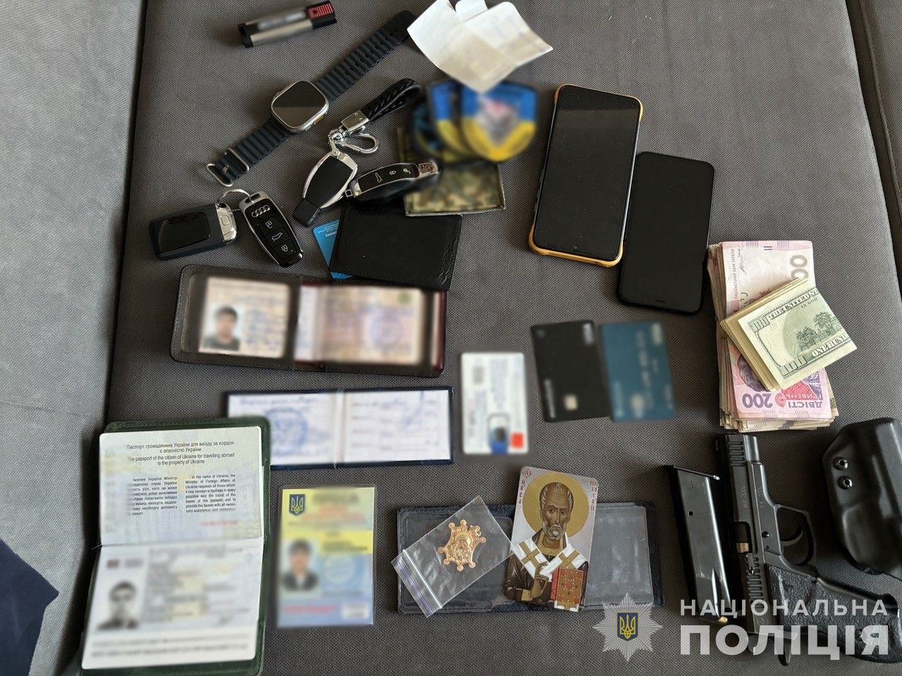 Во время обысков правоохранители изъяли банковские карты, компьютерную технику, мобильные телефоны, автомобили премиум-класса, поддельные удостоверения журналистов и членов общественных формирований, а также наличные деньги на общую сумму почти $7 тыс. и более 63 тыс. гривен.