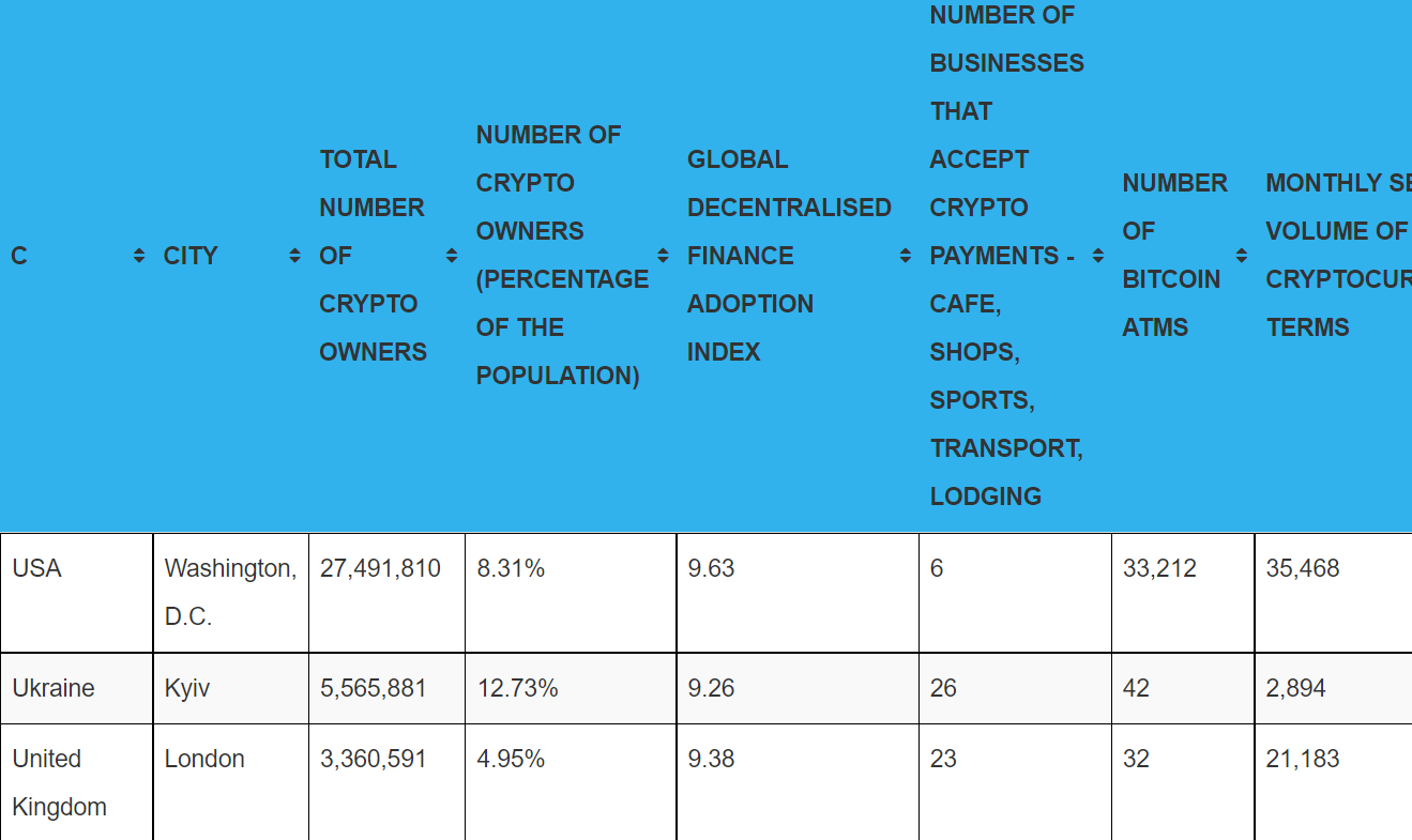Украина расположилась на втором месте вслед за США в списке наиболее активных стран по принятию криптовалют