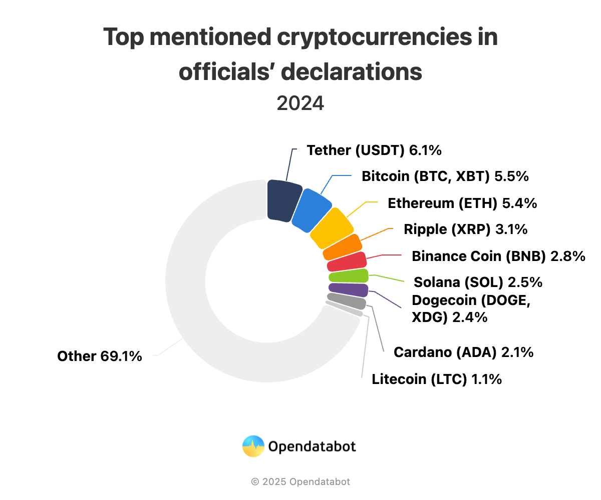 Среди криптовалют в декларациях чаще всего доминирует USDT — 802. Биткоином владеет 731 чиновник, а ETH — 713. Также в список самых популярных альткоинов вошли XRP, BNB, SOL, DOGE, ADA и LTC.