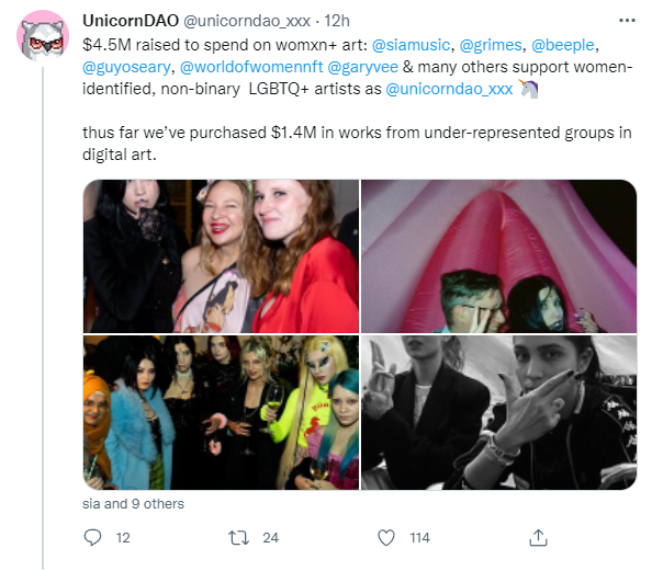 Сам проект UnicornDAO, по описанию, стремится «помочь построить инфраструктуру и наставничество для феминистской и квир-революций в блокчейне».