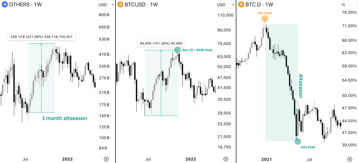 В 2017 году BTC достиг пика 17 декабря, после чего доминация начала падать, а альткоины росли до января 2018. В 2021 году пик пришелся на 10 ноября, и уже через 28 дней альтсезон завершился обвалом.