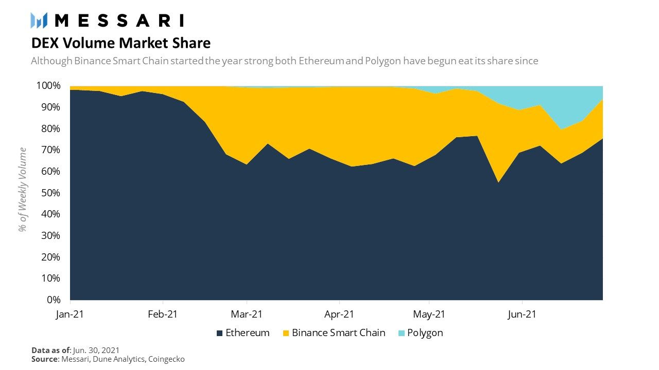 В Messari отмечают, что Uniswap быстро оправился от проблем, сопровождавших переход проекта на новую версию протокола, и отхватил себе более 40% рынка децентрализованных бирж. Снижение комиссий в сети Ethereum тоже привлекло часть пользователей BSC, где низкая стоимость транзакций считается главным конкурентным преимуществом.