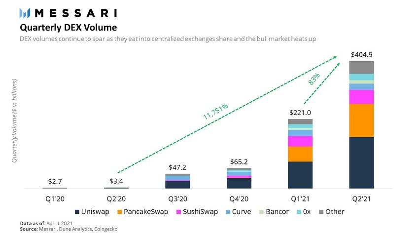 Объем торгов на децентрализованных биржах (DEX) вырос на 83% по сравнению с первым кварталом и превысил $400 млрд, говорится в отчете Messari.