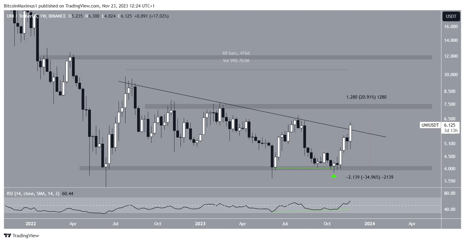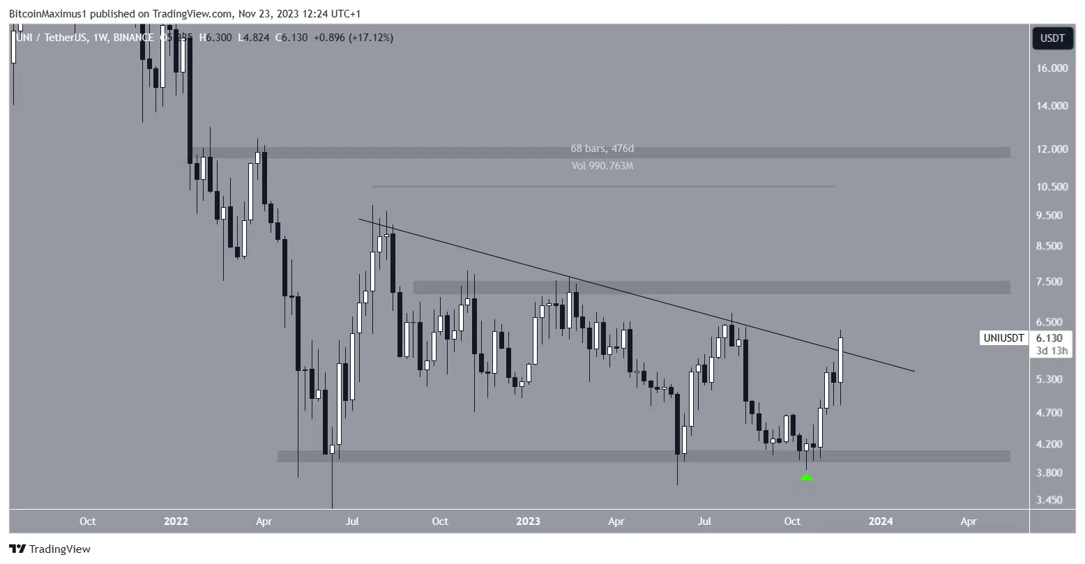 Все это время актив следовал за нисходящей линией сопротивления. Резкий рост привел Uniswap к достижению максимума $6,30 и первым прорывом выше этой линии за последние 480 дней. Однако для полной уверенности в продолжении ралли цена UNI должна закрыть неделю выше нее.