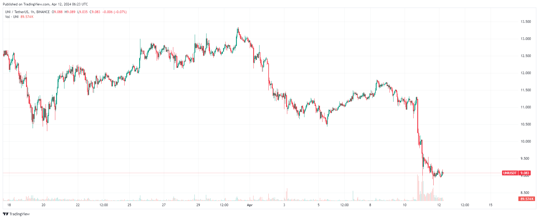 Действия Комиссии спровоцировали распродажу нативного токена криптобиржи UNI. Падение криптовалюты в моменте превысило 22%. После обновления локального минимума монета вышла в боковик. По состоянию на момент написания обзора, UNI торгуется по $9, что на 79% ниже максимума, зафиксированного 3 мая 2021 года на уровне $44.
