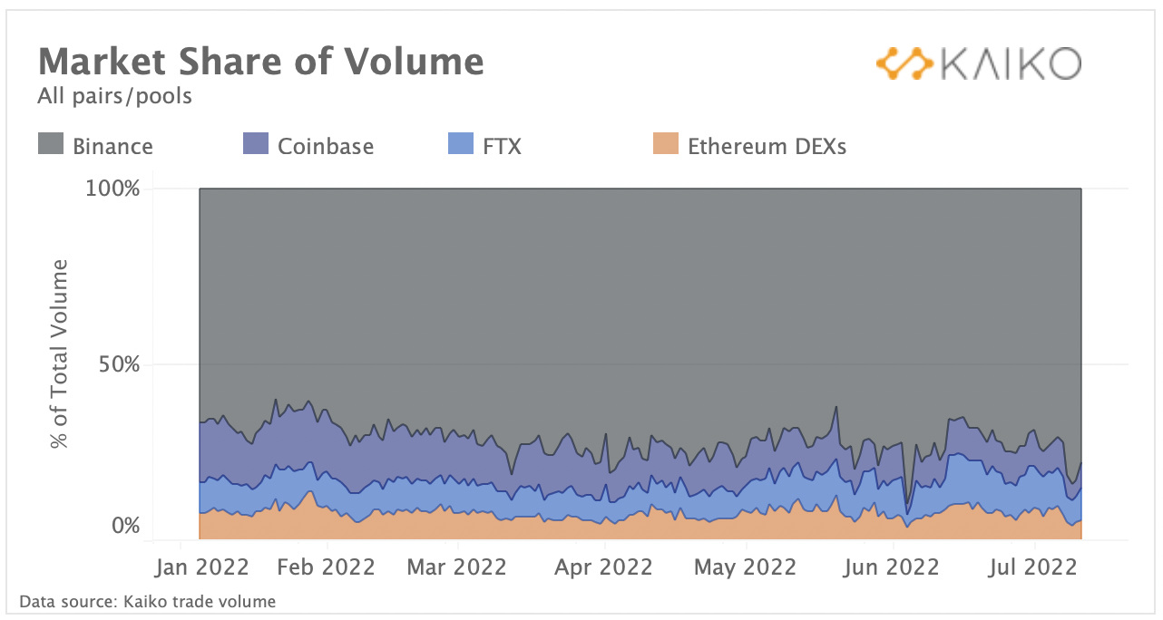 По подсчетам Kaiko, в июне на децентрализованные биржи приходилось всего 8% от общего объема по сравнению с тремя централизованными биржами (Binance, FTX и Coinbase).