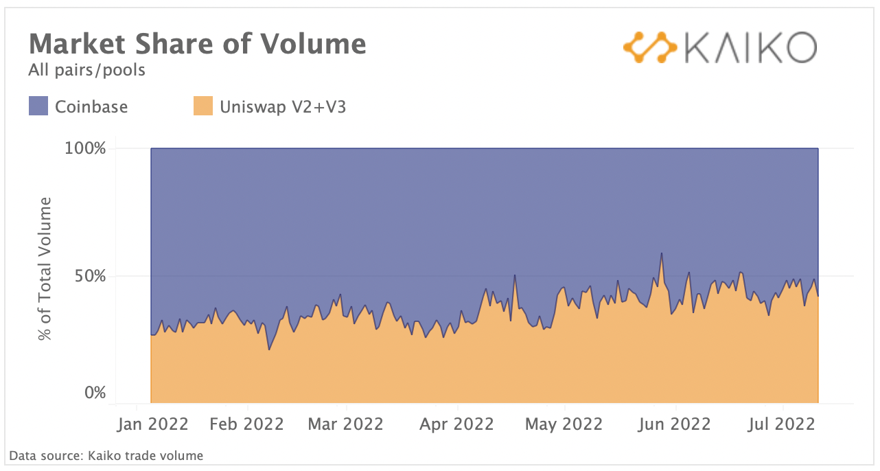 Рыночная доля Uniswap с начала года выросла с 27% до почти 50%, уравнявшись по объемам торгов с биржей Coinbase