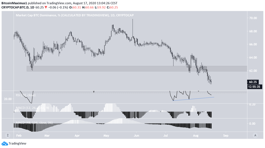 Уровень доминирования биткоина падает с 8 мая, когда индикатор достиг минимума под отметкой 70%. 25 июля BTCD достиг долгосрочной поддержки в районе 62%, после чего совершил бычий отскок.