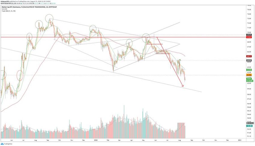 Но индикатор не смог удержаться на высоких уровнях, и 13 августа BTCD вернулся на исходные позиции, а в последующие дни опустился еще ниже. На момент написания статьи уровень доминирования находился непосредственно над отметкой 60%.