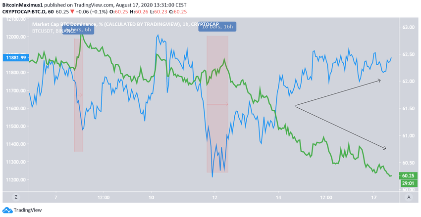 С начала августа наблюдается в основном обратная корреляция между уровнем доминирования (голубой цвет на графике) и самим курсом биткоина (зеленый цвет). Соответственно, при росте курса BTC уровень доминирования снижается, что особенно четко прослеживается на резких движениях.