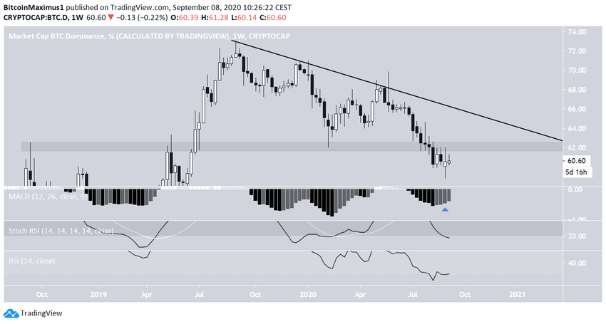 BTCD снижается с сентября 2019 года, когда был достигнут максимум на уровне 73.02%. С тех пор индикатор следует за линией нисходящего сопротивления. Изначально снижение носило плавный характер, но ускорилось в начале мая этого года.