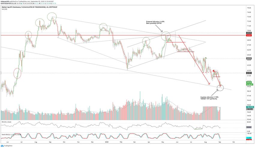 Итак, BTCD должен возобновить падение в направлении уровня 54%. Прорыв сопротивления 62% и линии нисходящего сопротивления аннулирует этот прогноз.