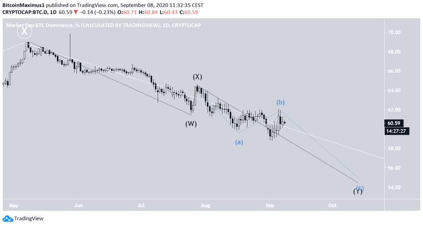 Волна Y указывает на наличие еще одной сложной коррекции (черный цвет на графике), внутри которой уровень доминирования находится на стадии финальной волны снижения, которая должна завершиться в диапазоне 49-54%.