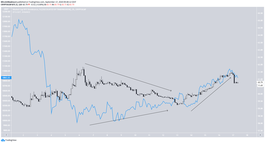 После резкого падения в начале сентября, BTCD плавно снижался, а курс биткоина преимущественно укреплялся. Однако по мере ускорения темпов подъема BTC уровень доминирования начал повышаться.
