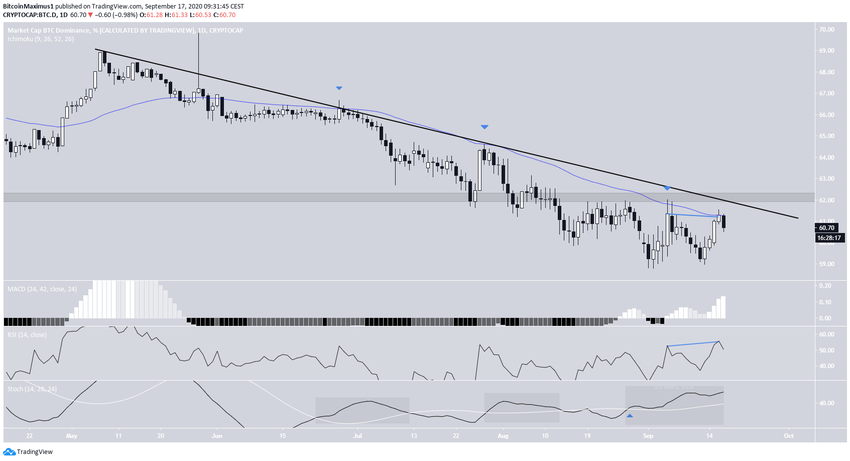 Уровень доминирования биткоина (BTCD) растет на протяжении недели, но пока так и не пробил ключевое сопротивление.