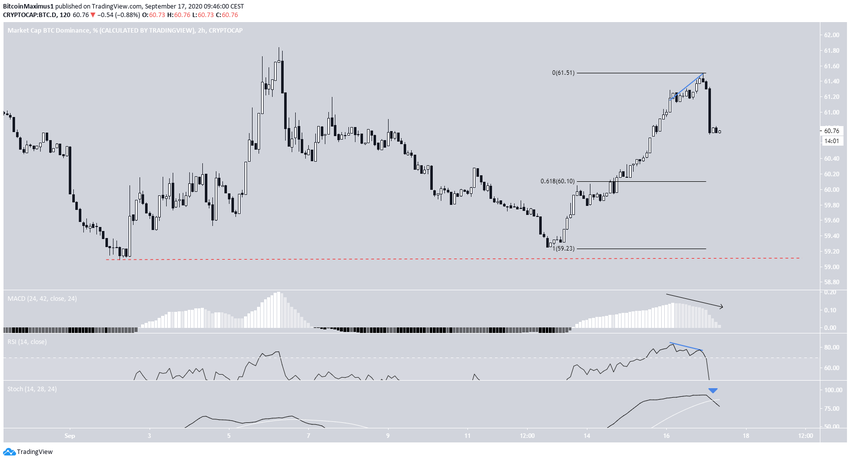 На более краткосрочных графиках наблюдается не самая оптимистичная картина. BTCD начал снижаться после появления сигналов медвежьей дивергенции со стороны RSI. MACD также движется в южном направлении, а стохастический осциллятор сформировал медвежье пересечение.