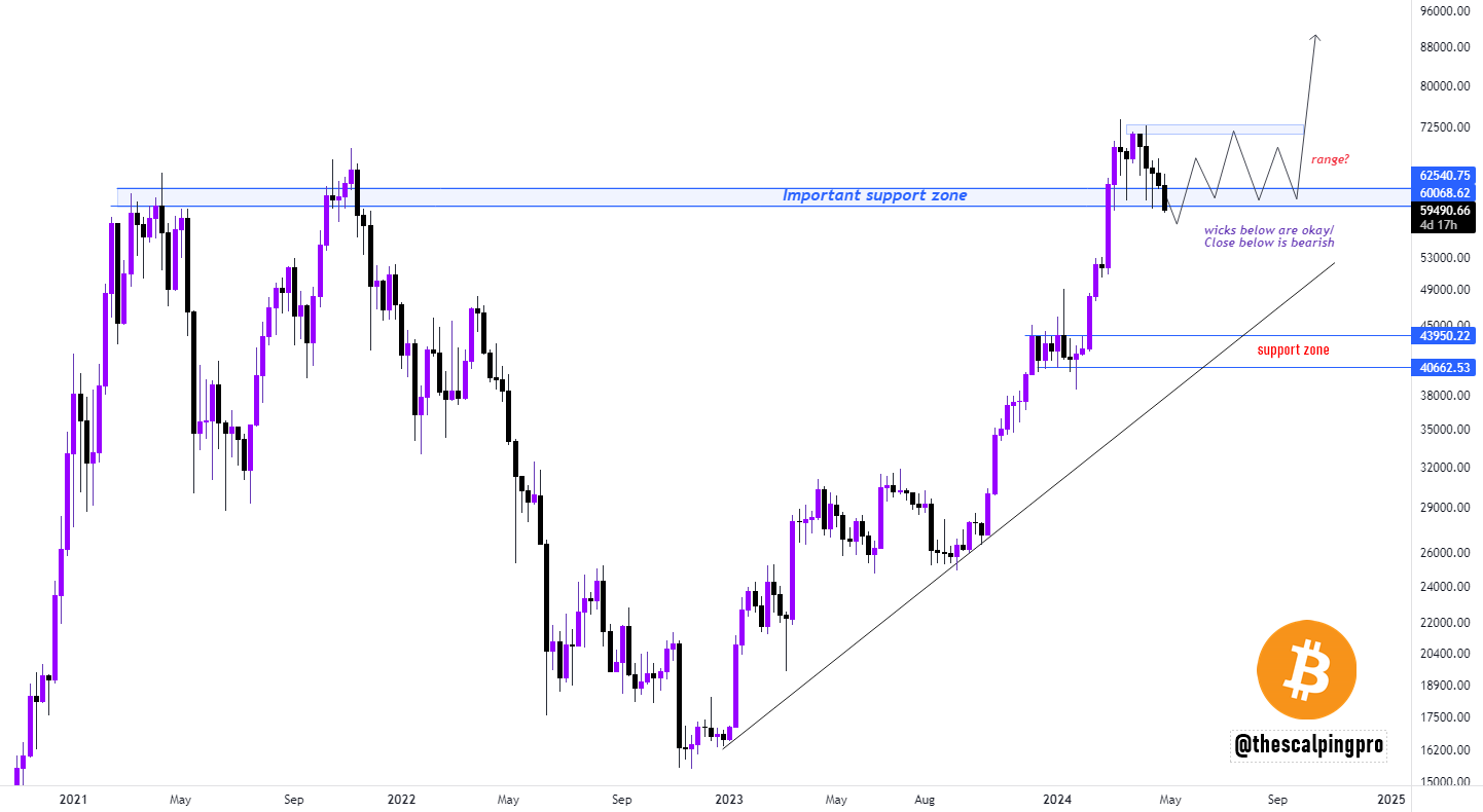 Автор канала 24KCrypto в X поддержал позитивный прогноз биткоина Captain Faibik. По его мнению, криптовалюта сможет обновить абсолютный максимум в конце мая. Предполагаемую траекторию монеты 24KCrypto обозначил на графике.