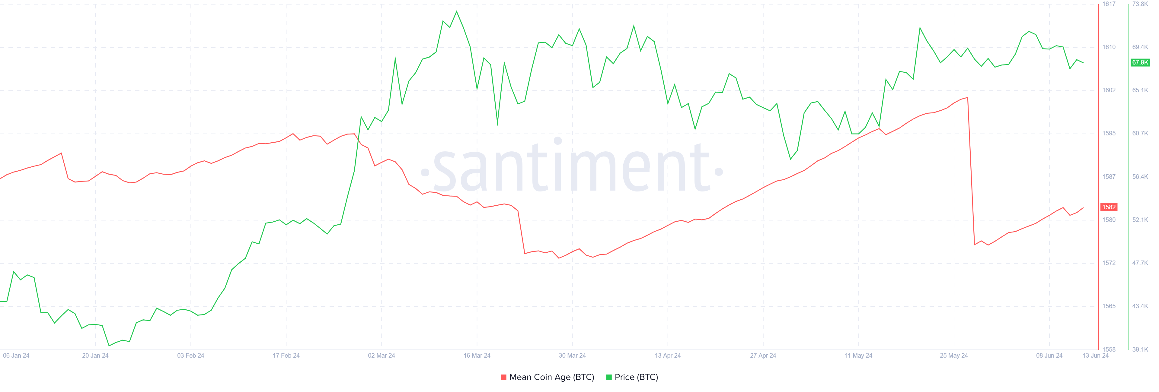 Ходлеры BTC также не лишены оптимизма — их уверенность в отношении будущего монеты, судя по всему, возвращается. Об этом свидетельствует состояние ончейн-метрики «средний возраст монет» (Mean Coin Age, MCA) — она вновь выросла после падения в марте и мае.