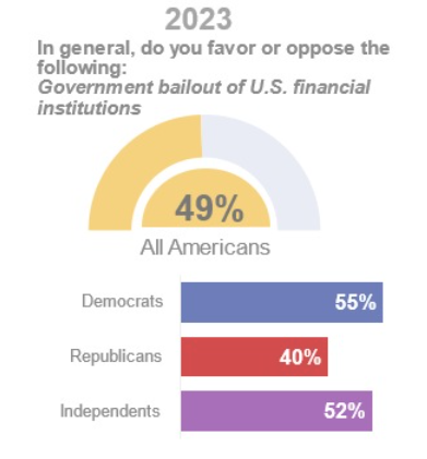 Тем не менее, большинство американцев по-прежнему доверяют традиционным финансовым учреждениям. Согласно опросу компании Ipsos, подавляющая часть населения США в достаточной или большой степени уверена в стабильности банковской системы и безопасности вкладов. Около половины респондентов считают, что государство должно предпринять меры для спасения испытывающих трудности компаний.