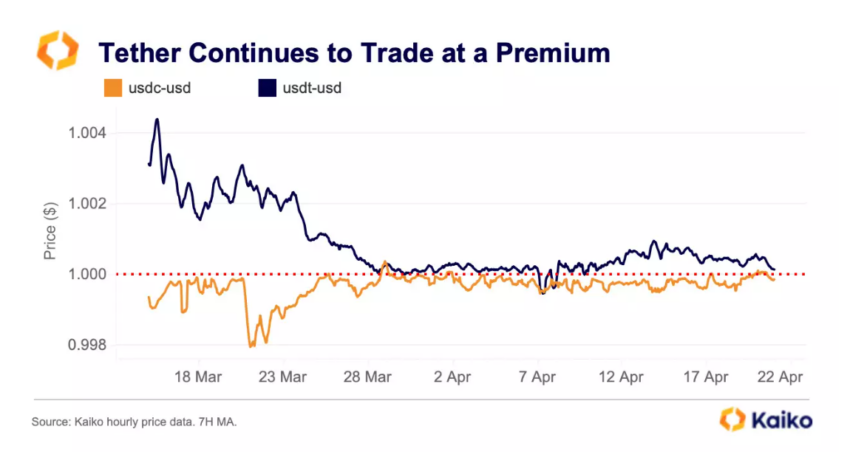 Согласно данным CoinMarketCap, USDT торгуется на уровне $1,0006, подорожав на 0,06% за последние 24 часа. Динамику актива нельзя списать на случайность: аналитическая платформа Kaiko подтверждает, что в течение апреля цена стейблкоина держалась выше $1 практически на всех централизованных биржах.