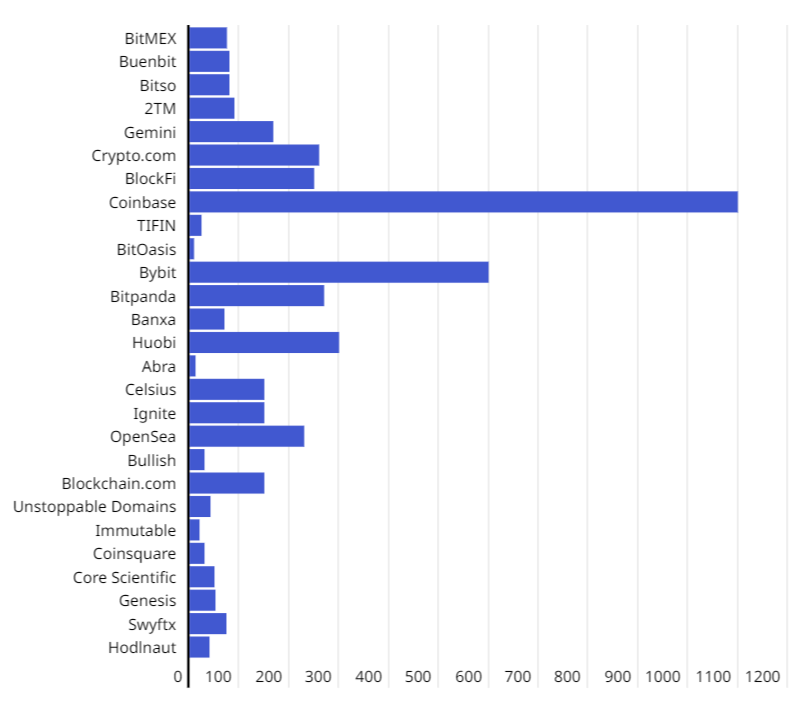 Как видно на графике ниже, больше всего под удар попали сотрудники американской криптовалютной биржи Coinbase. Там масштаб увольнений существенно опережает около 80% других компаний и составляет 1100 лиц. В рамках компании увольнения затронули около 18% персонала, утверждал глава торговой площадки Брайан Армстронг.
