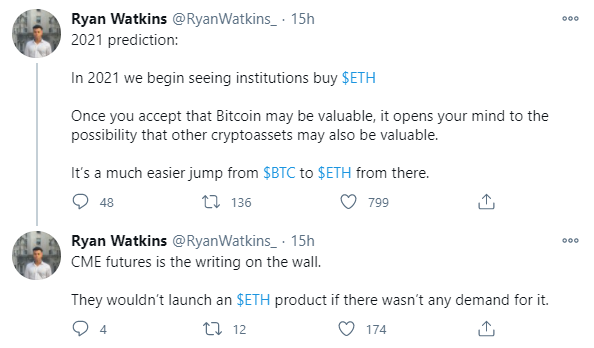 “Прогноз на 2021 год: в 2021 году институты начнут вкладываться в $ ETH. Если вы уже признали биткоин, как ценный актив, вам проще сделать следующий шаг и перейти с $ BTC на $ ETH” – написал Уоткинс.