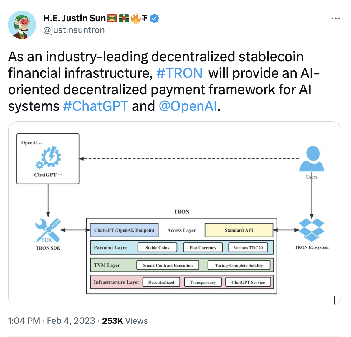 Представленная Саном концепция включает систему смарт-контрактов на основе Tron, протокол платежного уровня, базовый SDK для вызова и платежный шлюз ИИ.