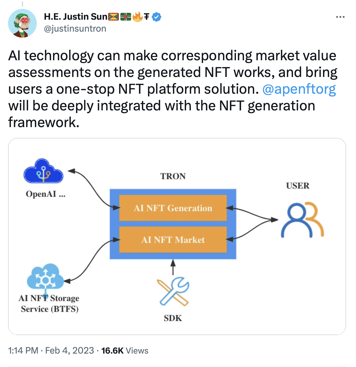 Кроме того, Джастин Сан намерен привлечь к платежной системе Just (JST), Sun (SUN) и маркетплейс APENFT. Таким образом, все связанные с Tron токены и проекты будут поддерживать ИИ-сервисы.