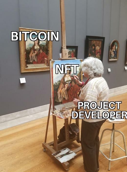 Также инвесторы в очередной раз обратили внимание на уникальность BTC. Для того, чтобы продемонстрировать попытки разработчиков других проектов воспользоваться техническими решениями биткоина в своих целях, пользователи запустили новый мем. На нем художник (разработчик), «срисовывает» (копирует) оригинал (BTC) в попытке выдать его за так называемый не взаимозаменяемый токен (NFT).