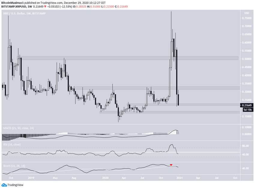На недельном графике можно увидеть, что область $0.32 играла роль поддержки, пока в ноябре курс XRP не прорвался выше нее. Теперь же по итогам прошлой недели токен пережил масштабный обвал и закрылся ниже этой области поддержки, превратив ее в сопротивление. Это значимое медвежье событие с точки зрения технических перспектив XRP. Оно сулит коину дальнейшую просадку.
