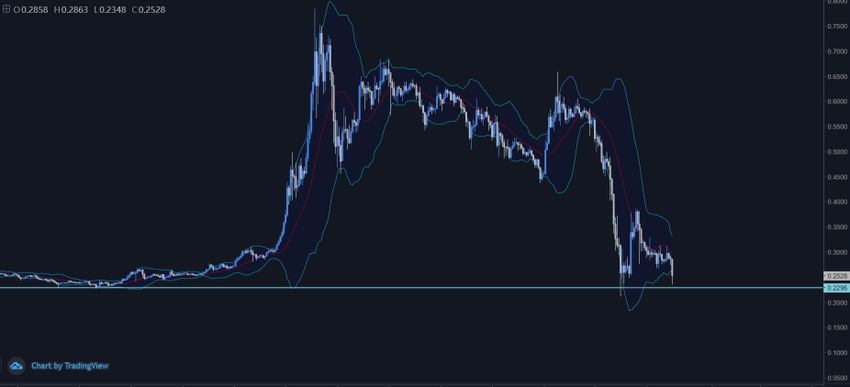 На момент написания цена уже атаковала поддержку на $0.22, взяв курс на следующий уровень $0.175.