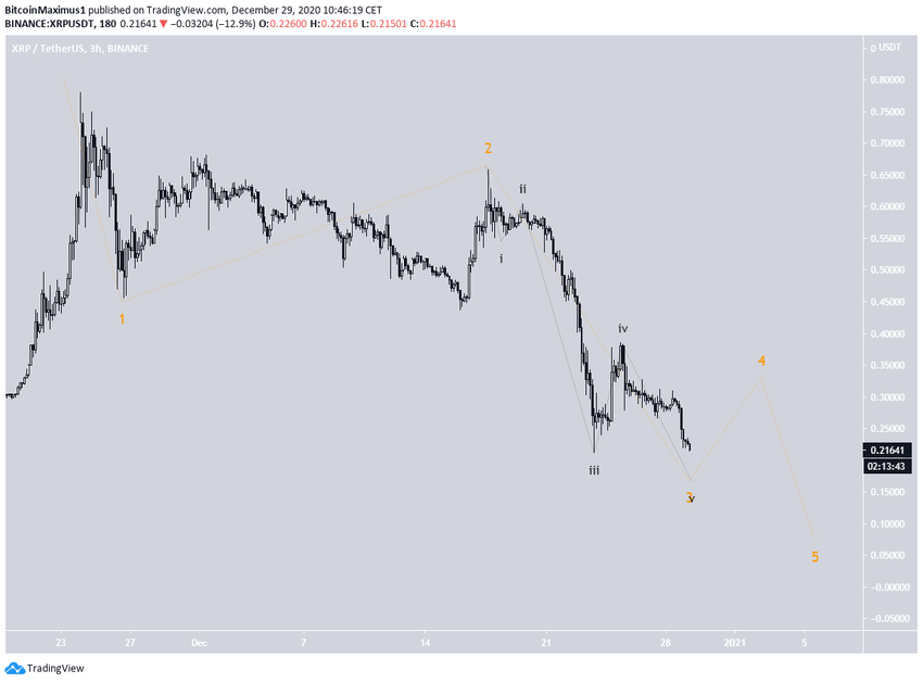 Результаты волнового анализа также выявляют медвежьи перспективы для XRP. Предположительно, цена находится сейчас в расширенной 3-й волне (оранжевый цвет), в рамках которой может достичь выделенной нами выше области поддержки $0.0175. После вероятного отскока отсюда, далее рынок может возобновить снижение.