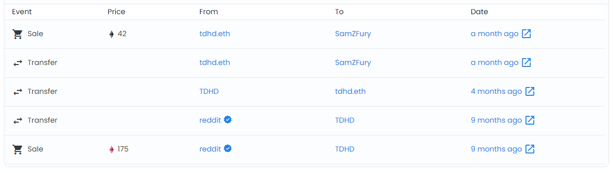 SponsoredДля этого пользователи должны выкупить NFT у нынешних владельцев. Например, один из первых покупателей NFT раскошелился на 115 ETH (~$400 000), поэтому ждать цены ниже вряд ли стоит. Впрочем, как видно ниже по истории сделок, один из владельцев NFT в свое время потратил на токен 175 wETH, а перепродал уже по 42 ETH.