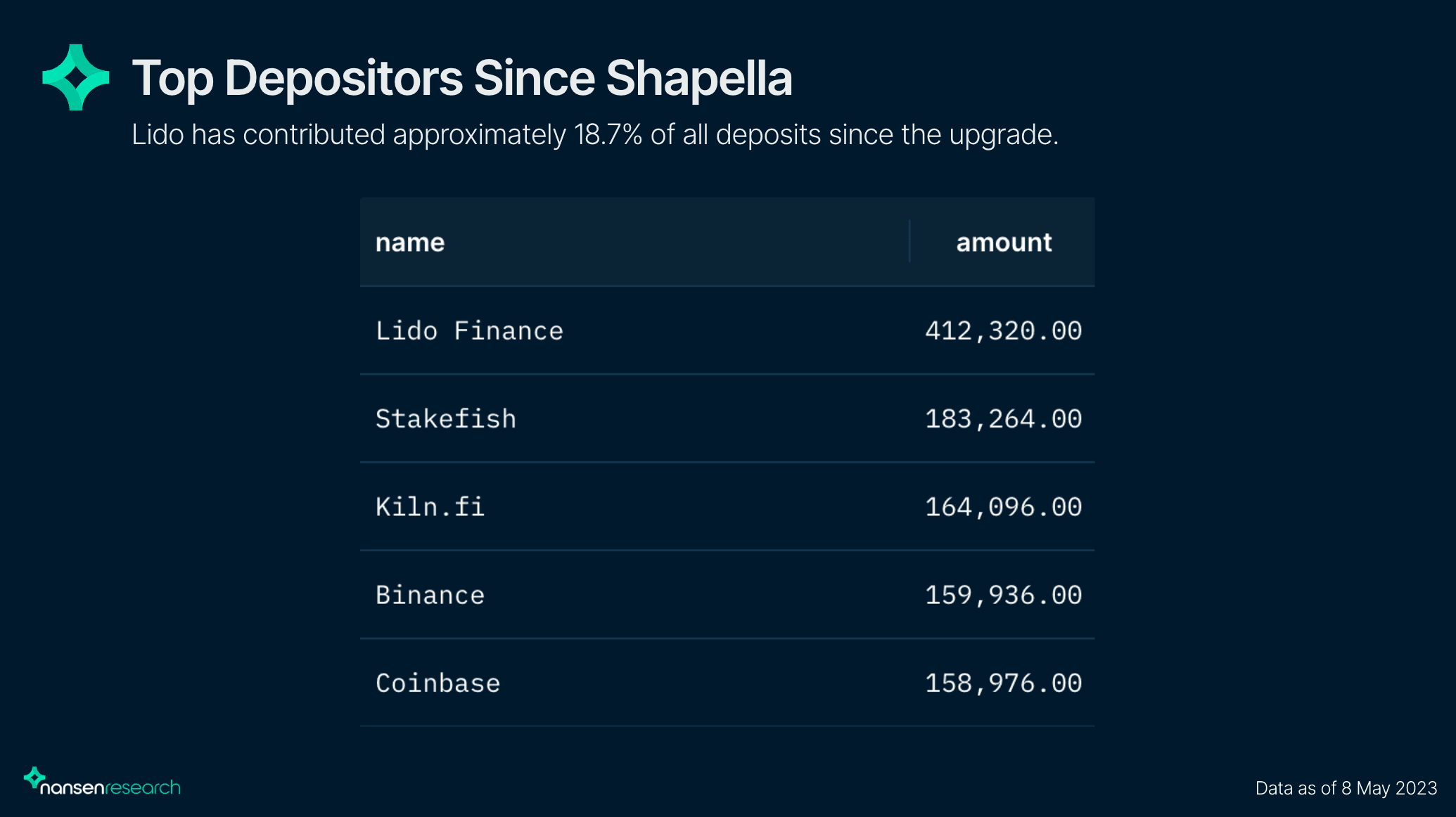 Примечательно, что после обновления Shapella наиболее популярными для стейкинга стали уже не биржи, а децентрализованные протоколы. Как подсчитали в Nansen, в лидеры по депозитам для стейкинга вышел DeFi-протокол Lido, куда поступило свыше 412 000 ETH. На втором месте оказался Stakefish со 183 000 ETH, а тройку закрыл Kiln.fi со 164 000 ETH. О том, что ждет экосистему Ethereum после обновления Shapella — читайте в специальном материале редакции BeInCrypto.