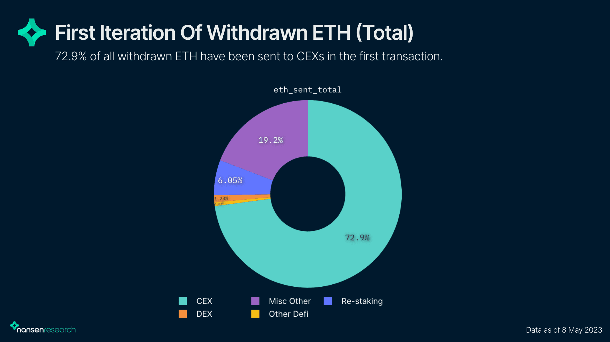 Как подсчитали в Nansen, почти 73% выводимой со стейкинга криптовалюты отправили на централизованные биржи. Впрочем, такая активность еще не значит, что валидаторы побежали продавать заработанную на процентах криптовалюту. Аналитики считают, что столь большой процент по отношению к биржам обусловлен тем, что именно на централизованных площадках и были организованы услуги по стейкингу. Иными словами, биржи выводили со стейкинга ETH на свои же кошельки, чтобы в дальнейшем раздать клиентам.