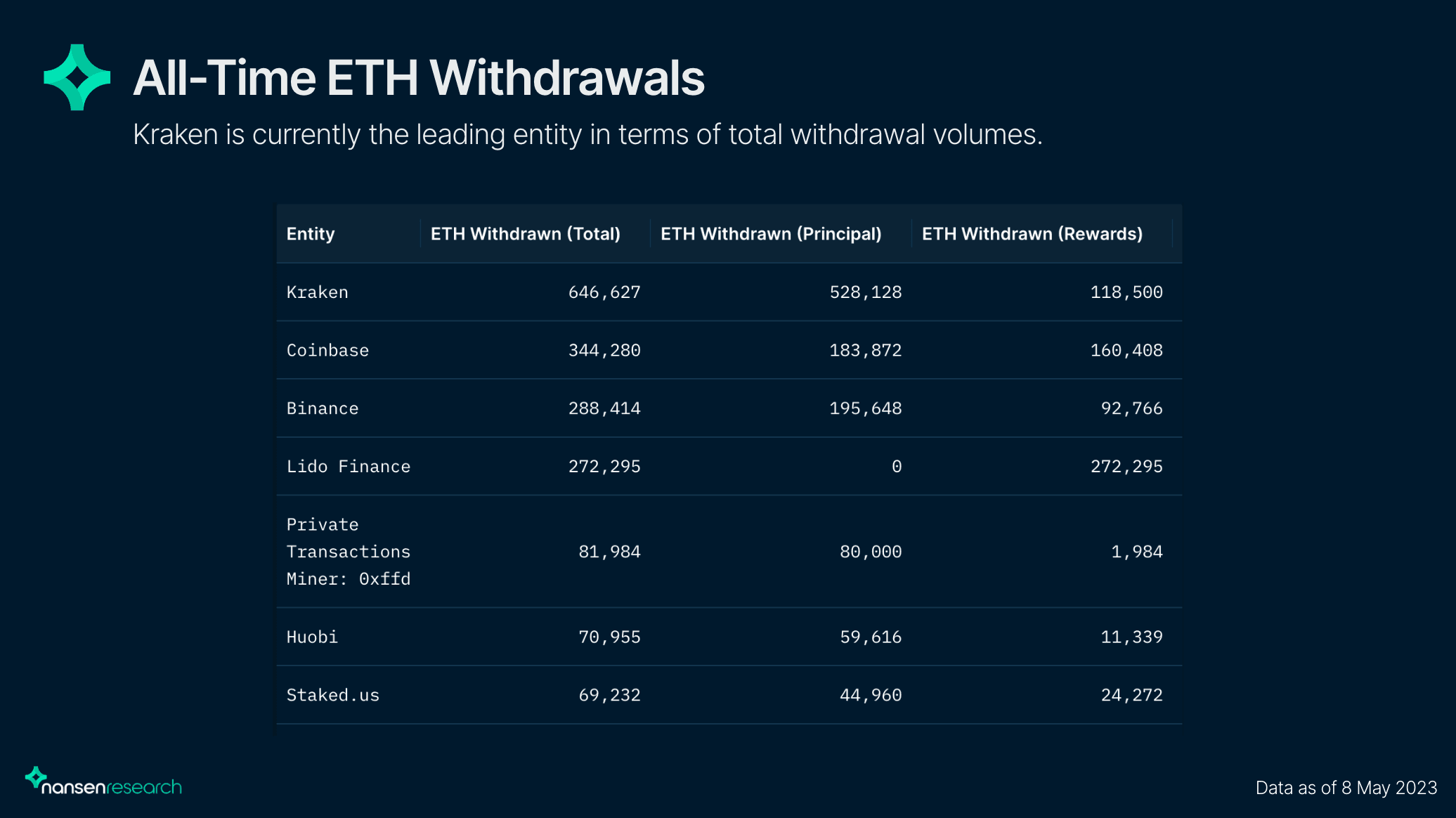 По их данным, в лидеры по оттоку ether (ETH) со стейкинга вышла криптовалютная биржа Kraken, с которой вывели 647 000 ETH (почти треть выводимой криптовалюты со стейкинга). Впрочем, в Nansen отмечают, что лидерство Kraken по оттоку ether может быть обусловлено претензиями к сервисам биржи со стороны Комиссии по ценным бумагам и биржам (SEC) США.