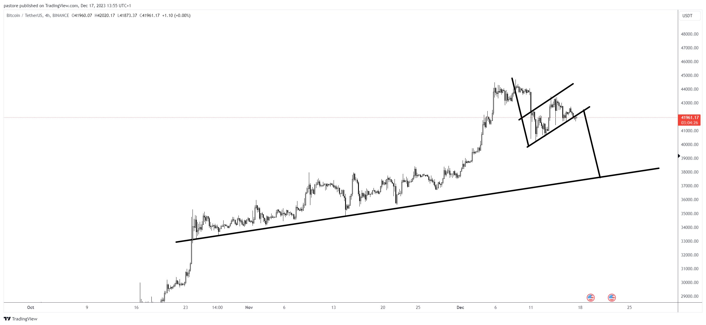 Впрочем, некоторые участники криптосообщества видят потенциал дальнейшей коррекции. Например, блогер Alejandro™ не исключает снижения BTC в район $36-37 тыс. Свой негативный прогноз биткоина он объяснил вероятным прорывом криптовалютой границы фигуры технического анализа, которая указывает на перспективу коррекции.