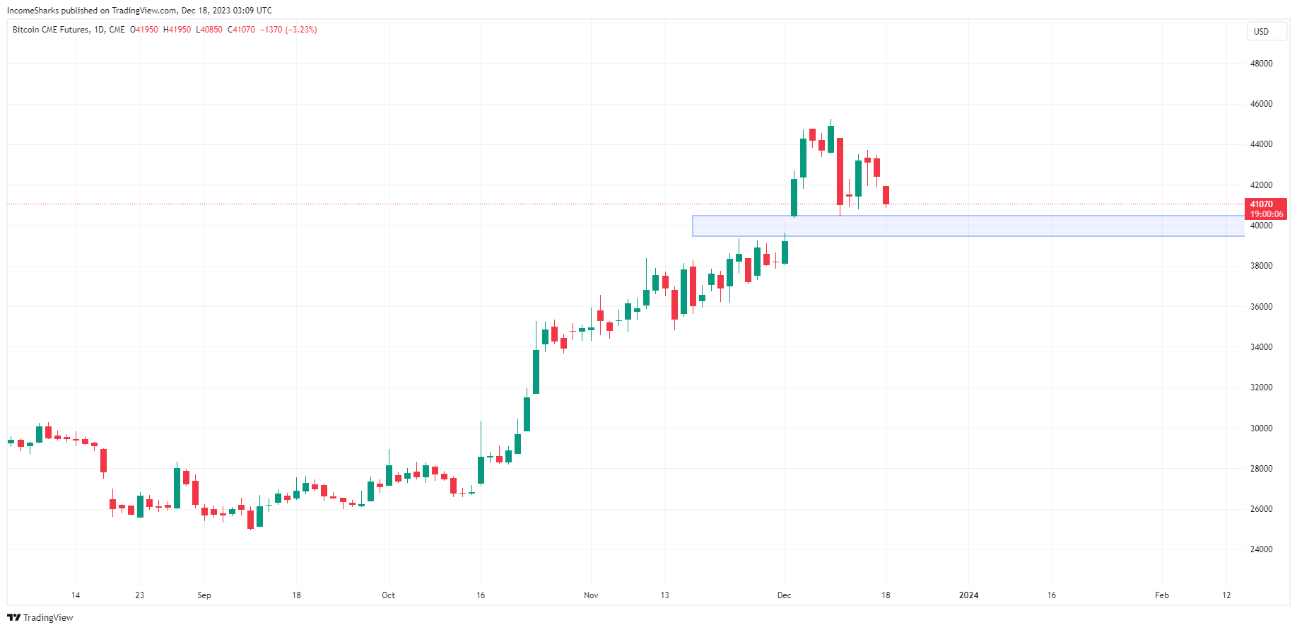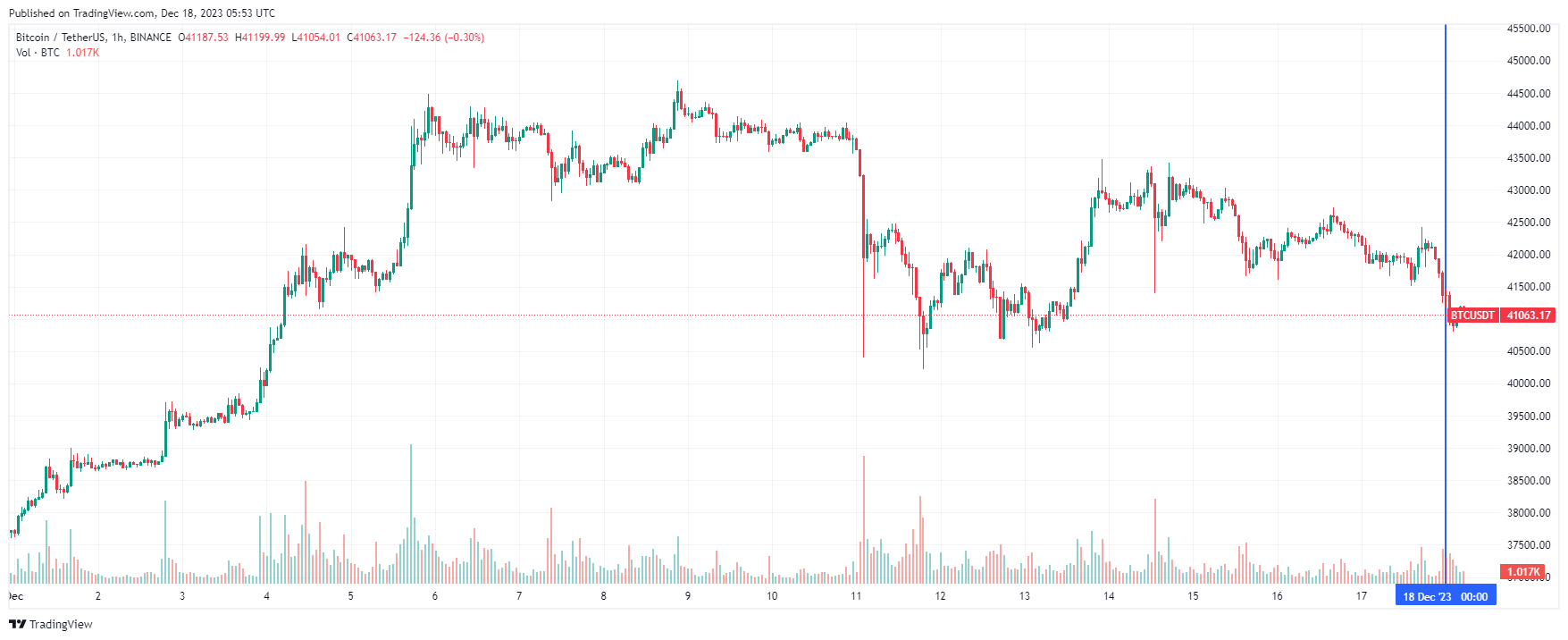 Биткоин начал новую рабочую неделю со снижения. По состоянию на момент написания обзора, монета торгуется по $41 063. Напомним, 8 декабря 2023 года BTC обновил годовой максимум на уровне $44 700, после чего вышел в коррекцию. Прошлую неделю криптовалюта провела в диапазоне $40 200 — $43 500.