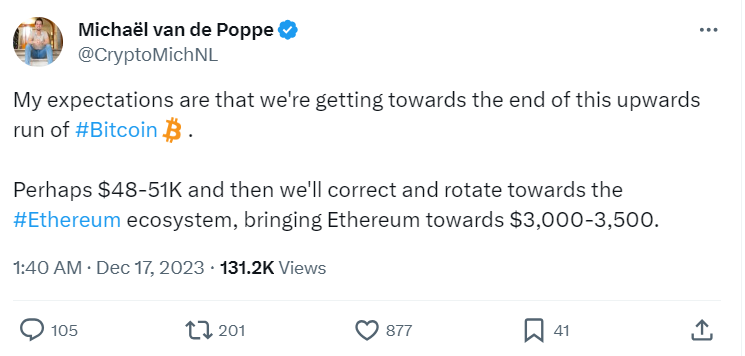Аналитик Майкл ван де Попп считает, что у BTC есть запас роста до $48-50 тыс. После достижения обозначенной высоты, по его мнению, криптовалюта выйдет в коррекцию. При этом аналитик не обозначил временные рамки для реализации своего прогноза биткоина.
