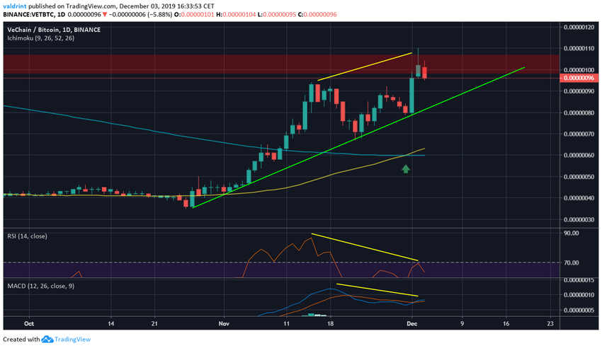 VeChain следует за восходящей линией поддержки. С 14 ноября цена откатывалась в тандеме с нисходящей линией сопротивления, но в начале декабря совершила прорыв на очень высоких объемах.