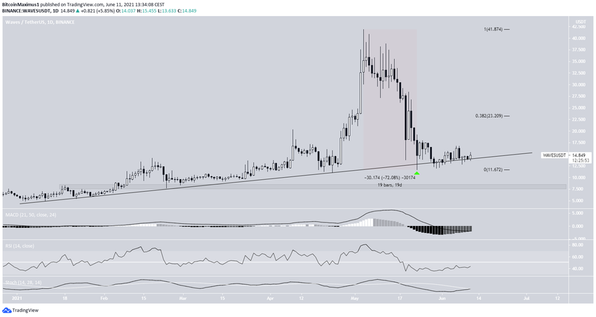 За 19 дней с 4 по 23 мая курс WAVES снизился на 72%. Цена протестировала долгосрочную восходящую поддержку, которая формируется с начала года.