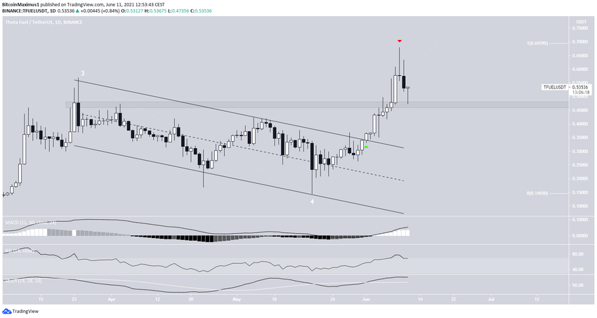 TFUEL вырвался за пределы нисходящего параллельного канала 1 июня. Рост продолжался до 9, июня, в итоге цена достигла уровня $0,679.