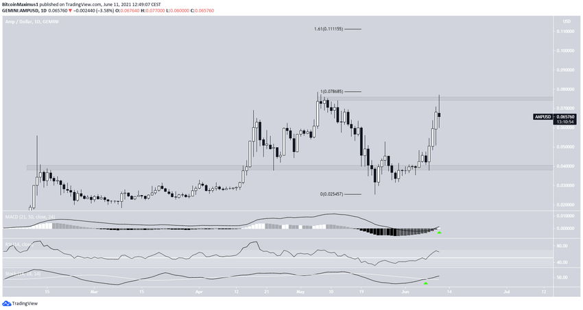 AMP оттолкнулся от поддержки 23 мая и с тех пор растет. Цена поднялась выше $0,04 и протестировала эту область в качестве поддержки.