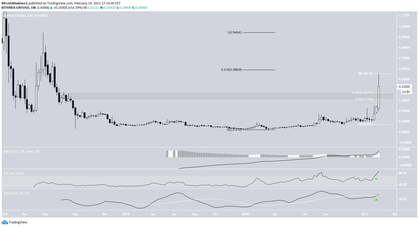 GLM значительно вырос на этой неделе, поднявшись с минимума в $0,198 доллара до максимума $0,63. В результате роста монета преодолела важное сопротивление $0,33, которое сдерживало восходящую динамику с июня 2018 года.