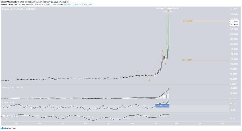 Кроме того, BNB, похоже, находится в пятой и последней волне бычьего импульса и уже достиг потенциальной цели восходящего движения.
