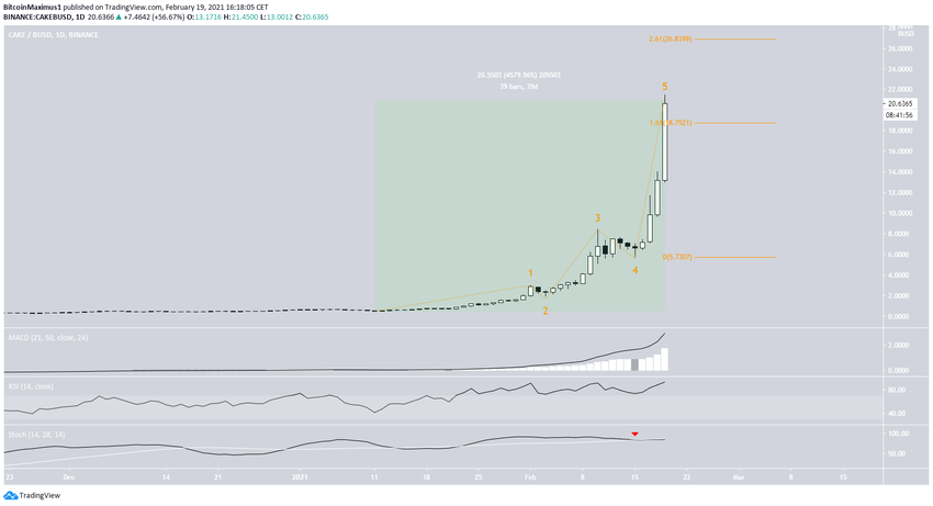 CAKE начал быстро расти 11 января, когда монета зафиксировала минимум в области $0,44. С тех пор курс CAKE вырос на 4 580% и достиг $21,45. Это произошло 19 февраля.