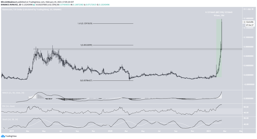 RVN демонстрирует значительный восходящий тренд с 28 января. За 18 дней монета подорожала на 800%. RVN достиг исторического максимума на уровне $0,135 18 февраля.